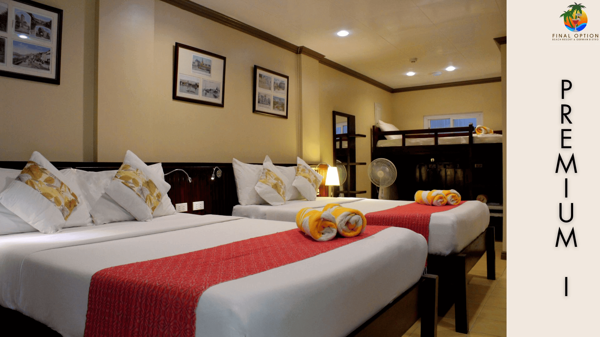 Located at the 1st floor with a 32sqm living space comes with 2 Queen Beds and 1 Bunk Bed can fit in 6 persons. The full air-conditioned room is equipped with solar powered hot and cold shower and bath amenities, flat screen cable TV with USB ports. Also equipped with Safety deposit Box, in-room wifi router, intercom and Mini Bar (extra charge may apply). Guests may enjoy complimentary use of Pool, Whirlpool and Cottages located at the beachfront. Non- smoking.